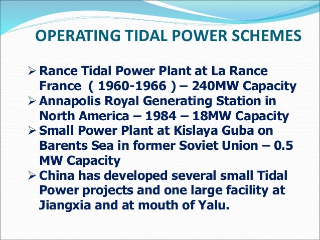 Tidal energy is a form of power generation that is created as the tides and the currents of the ocean rise and fall. Tidal current generator will be in nova scotia (bay of fundy). The station is the world's 5th largest tidal power plant with the output capacity of 1.7 megawatts. Tidal power converts the powerful ocean tides into electricity.